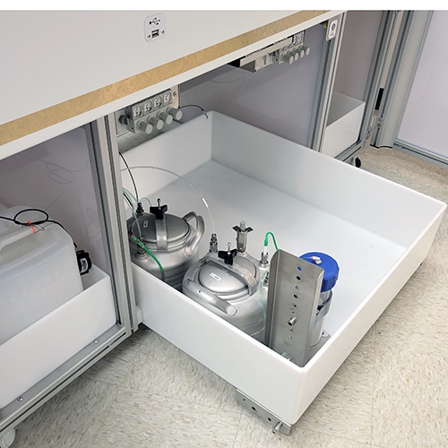 Integrated lower cabinet fume exhaust and a roll-out drawer for secondary containment of process chemicals.